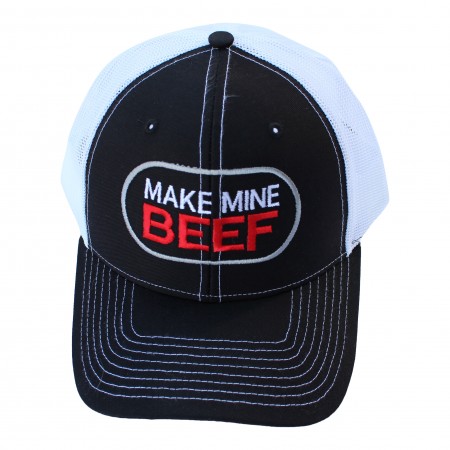 Inspired by a recent vintage find, these “Make Mine Beef” hats are the perfect way to show your support of the Beef Industry.  This particular hat made by Richardson is a structured trucker style with a snap back. Black front with red, white, and silver stitching.